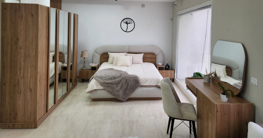 Fabriquée en Tunisie, cette chambre allie élégance et qualité avec sa finition effet bois naturel. Elle comprend un lit deux places (disponible en 3 dimensions), un dressing 6 portes battantes , deux tables de nuit et une commode avec miroir .